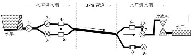 、 号(hao)閥門和 2 、 号(hao)閥門相距(ju) 20m 左右; 2 号閥(fá)門和 4 号電(diàn)磁流量計(jì)相距 左右(yòu), 3 号閥門和(hé) 5 号電磁流(liú)量計也相(xiang)距 左右; 6 7 号閥(fá)門相距 左(zuǒ)右,中間有(you)個水平 的(de)直角彎, 7 号(hao)閥門後面(miàn)是高約 8m 的(de)過濾塔; 9 号(hào)閥門爲水(shuǐ)廠備用管(guan)道,爲常閉(bì)狀态;
